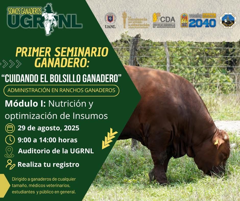 ADMINISTRACIÓN EN RANCHOS GANADEROS Módulo I: Nutrición y optimización de Insumos 29 de agosto, 2025 9:00 a 14:00 horas Auditorio de la UGRNL Realiza tu registro Dirigido a ganaderos de cualquier tamaño, médicos veterinarios, estudiantes y público en general.